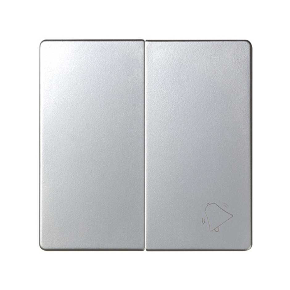 Forma cuadrada, tamaño 55 x 55 mm y color aluminio. Este componente es una tecla doble para un grupo de 1 conmutador y 1 pulsador de la serie Simon 82. Incluye grabado de campana.