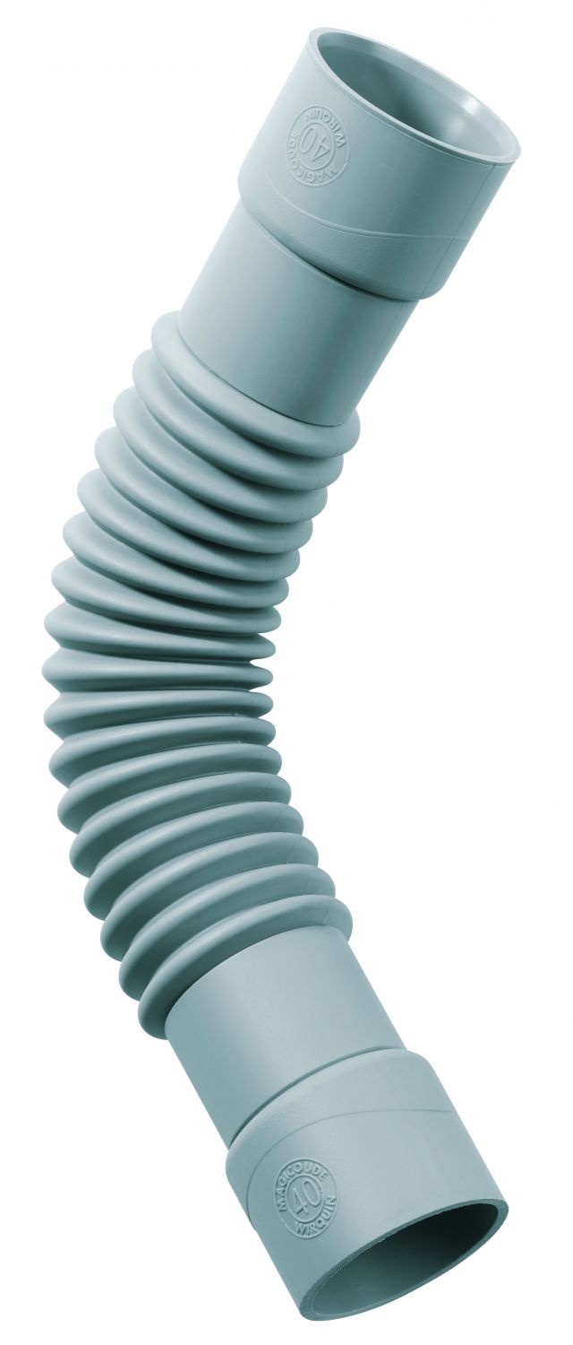 El MAGICOUDE UNIVERSAL WIRQUIN Ø40 es un codo de PVC flexible a encolar diseñado para resolver problemas de alineación y ángulos complejos en instalaciones de desagüe. Se adapta a diferentes configuraciones de conexión simplemente cortando una o ambas puntas según necesidad.
